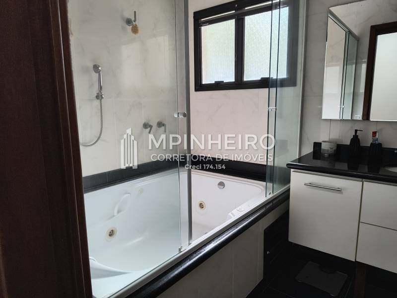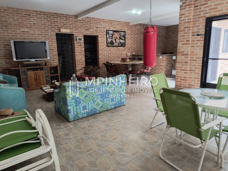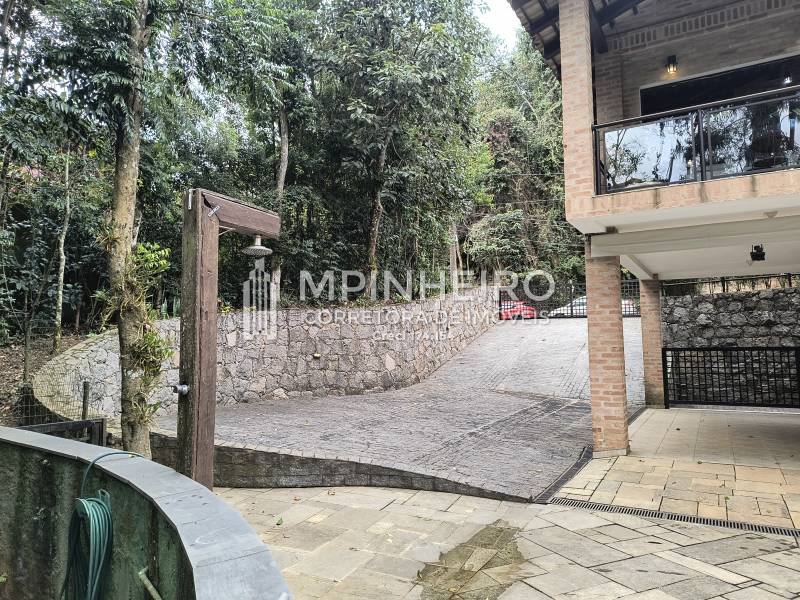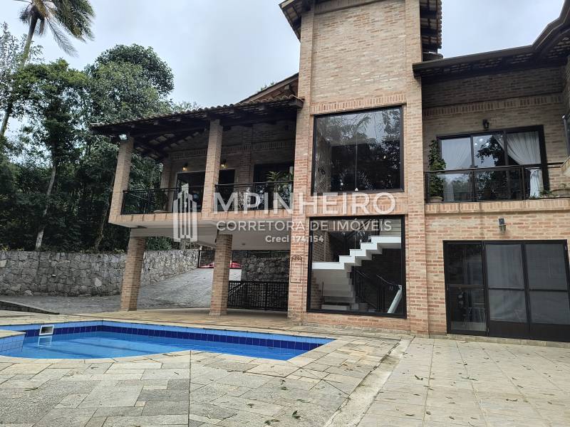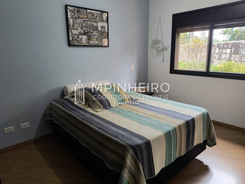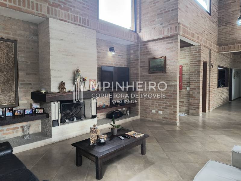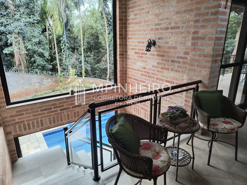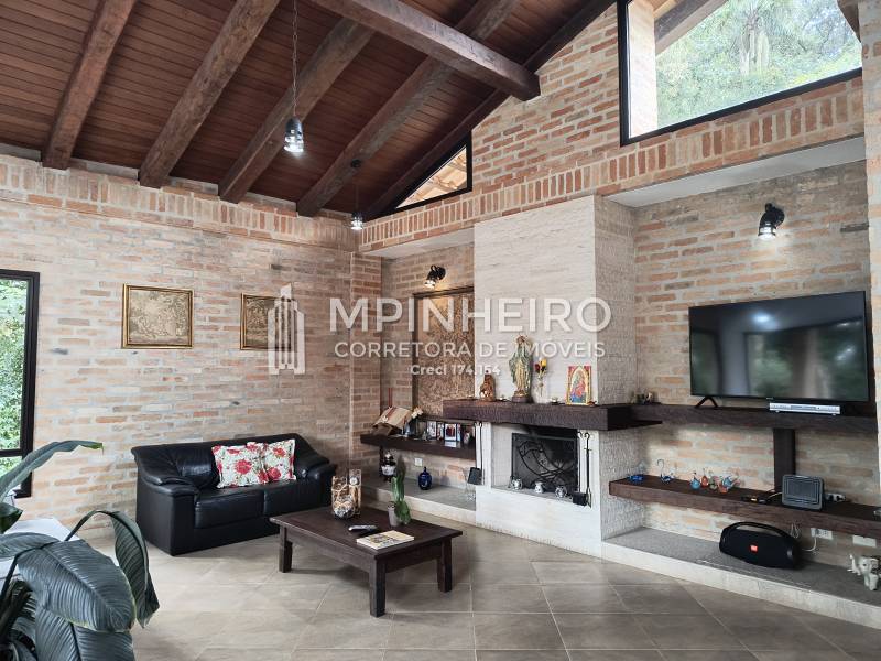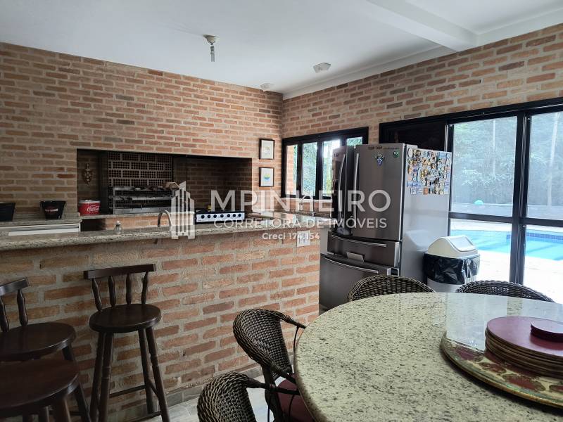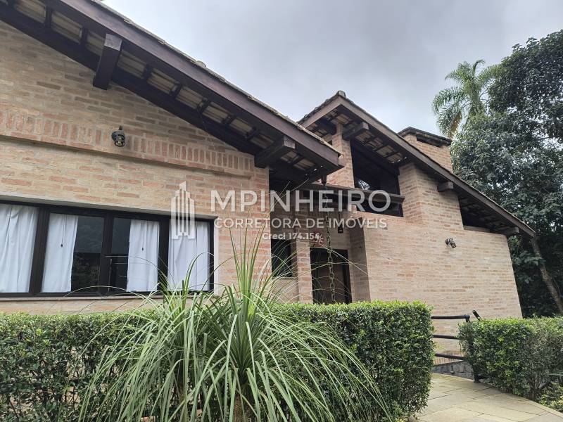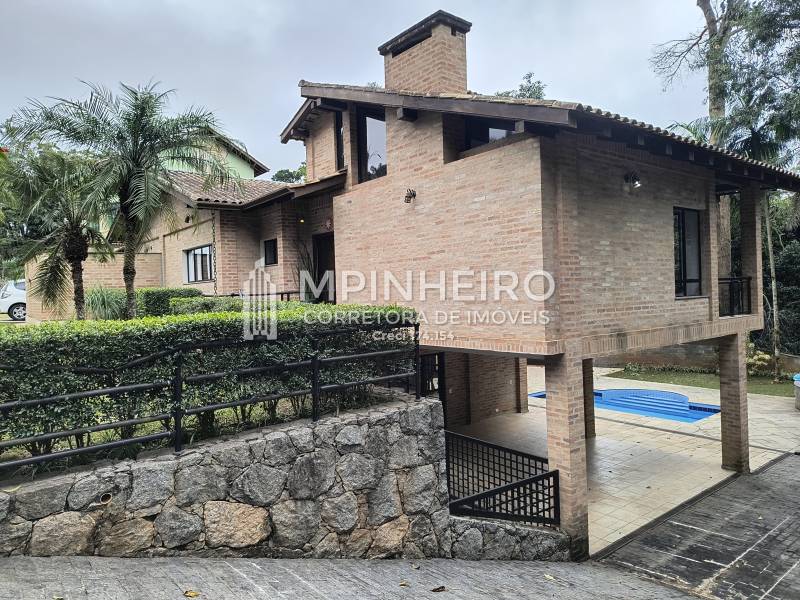 Casa estilo rústico em condomínio fechado com 3 suítes, sendo 01 master (closet e hidromassagem), + 1 dormitório, cozinha com armários planejados estilo americana integrada com a sala de jantar, salas de estar, lareira e jantar, todas avarandadas para a mata verde, bem iluminada, dispensa, lavanderia.