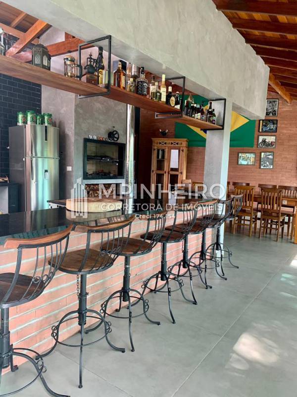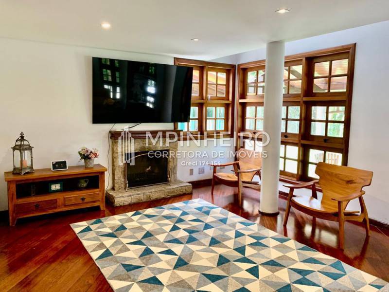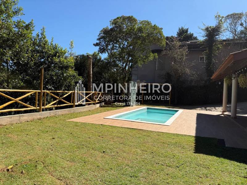 Casa estilo serrano com 4 dormitórios, sendo 3 suítes + 1 master com hidromassagem e closet. Possui 2 salas com lareira, sendo uma de visita e uma de TV, sala de jantar, bar e adega. Cozinha com armários planejados e despensa, lavanderia interna. Área gourmet com churrasqueira parrilla argentina e fogão a lenha, piscina. Depósito com marcenaria, casa de caseiro com quarto, cozinha e banheiro.