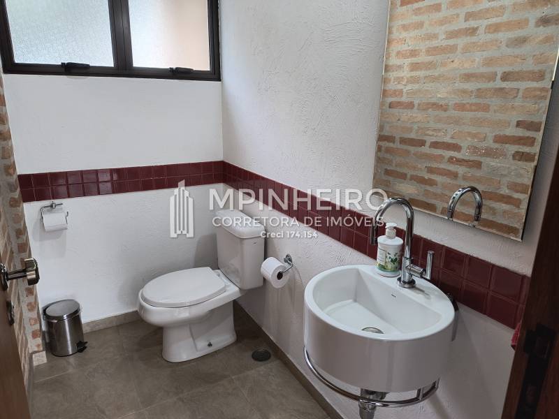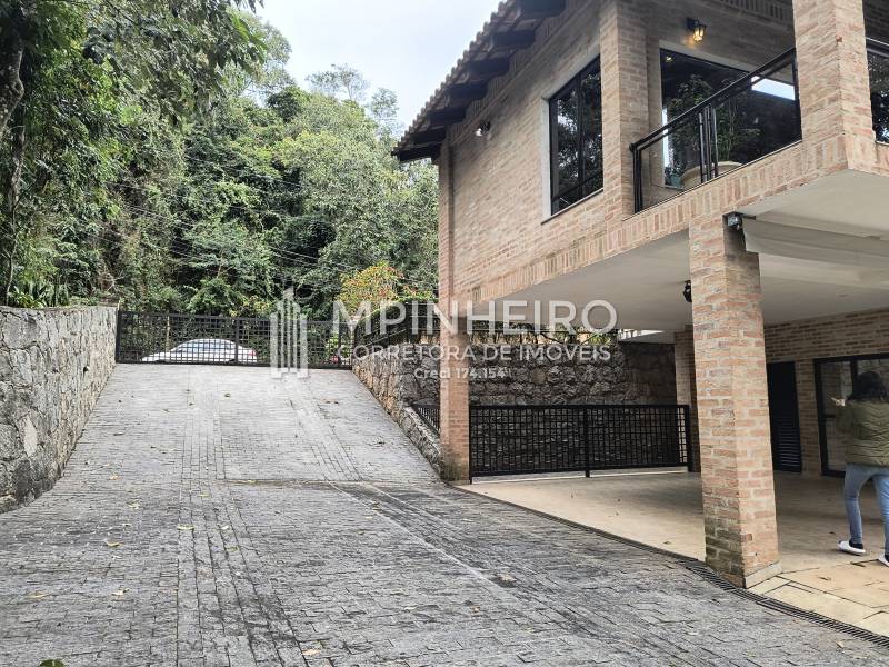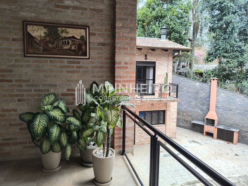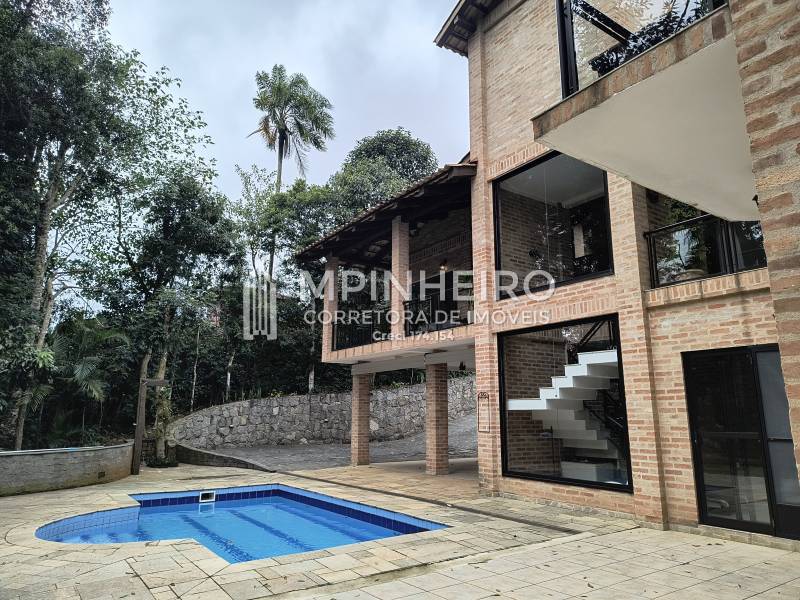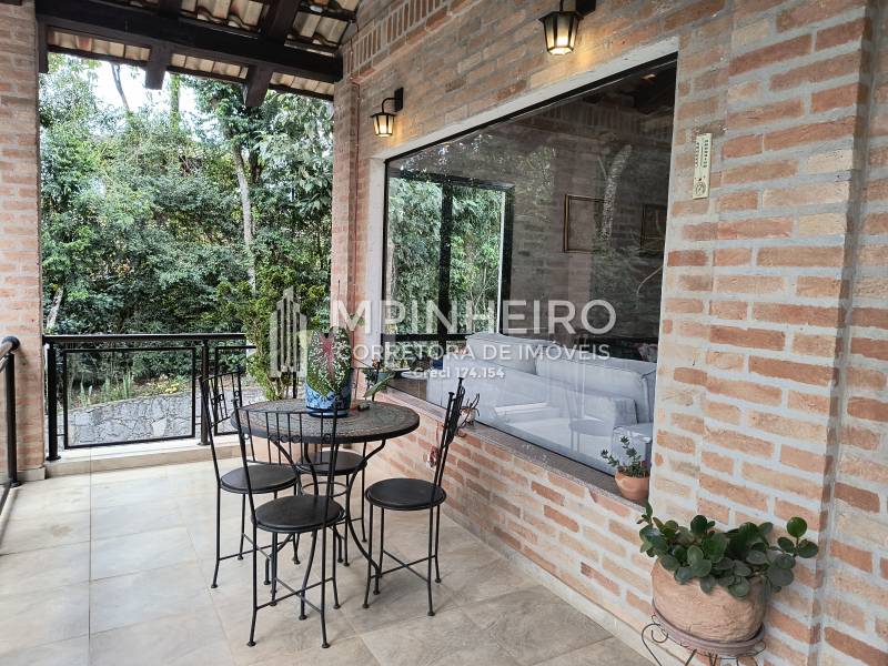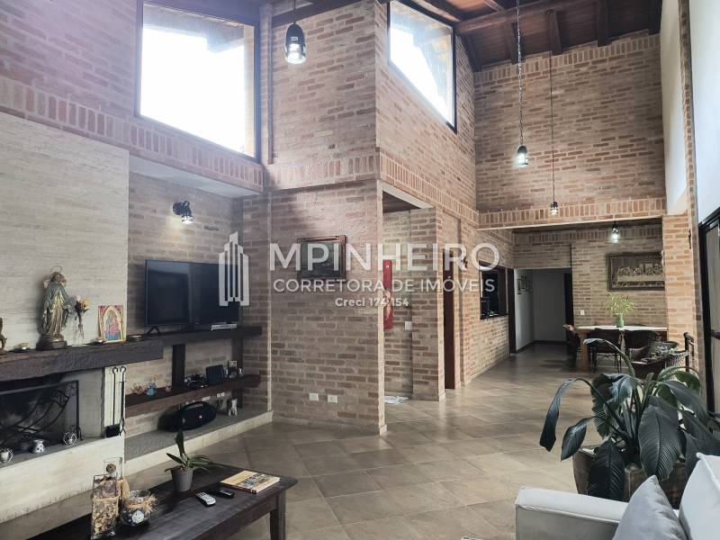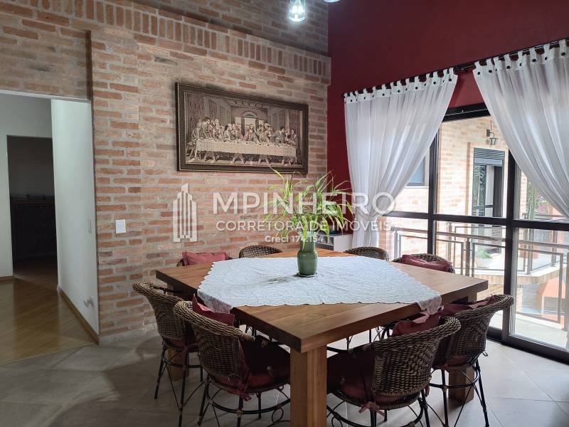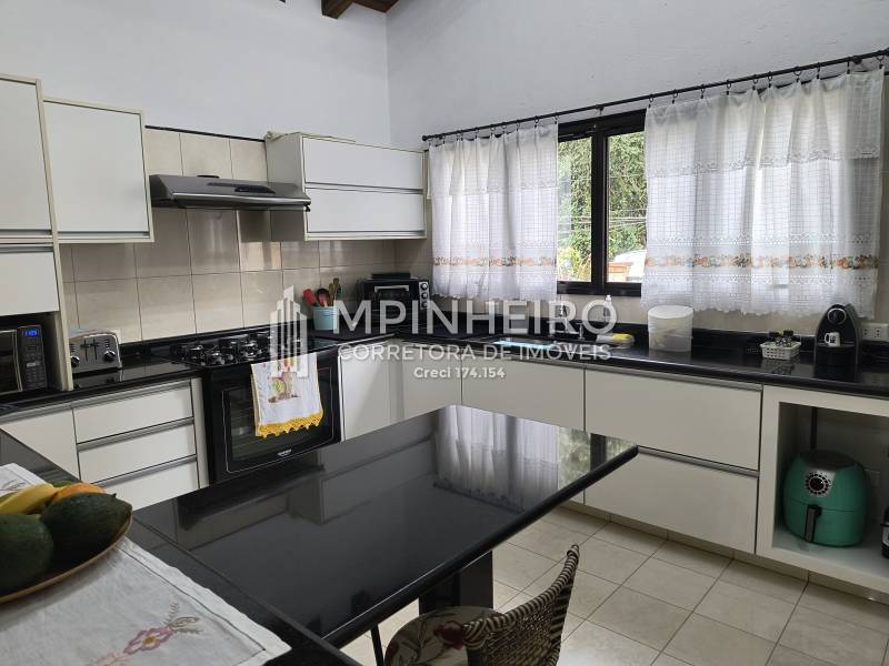 Casa estilo rústico em condomínio fechado com 3 suítes, sendo 01 master (closet e hidromassagem), + 1 dormitório, cozinha com armários planejados estilo americana integrada com a sala de jantar, salas de estar, lareira e jantar, todas avarandadas para a mata verde, bem iluminada, dispensa, lavanderia.