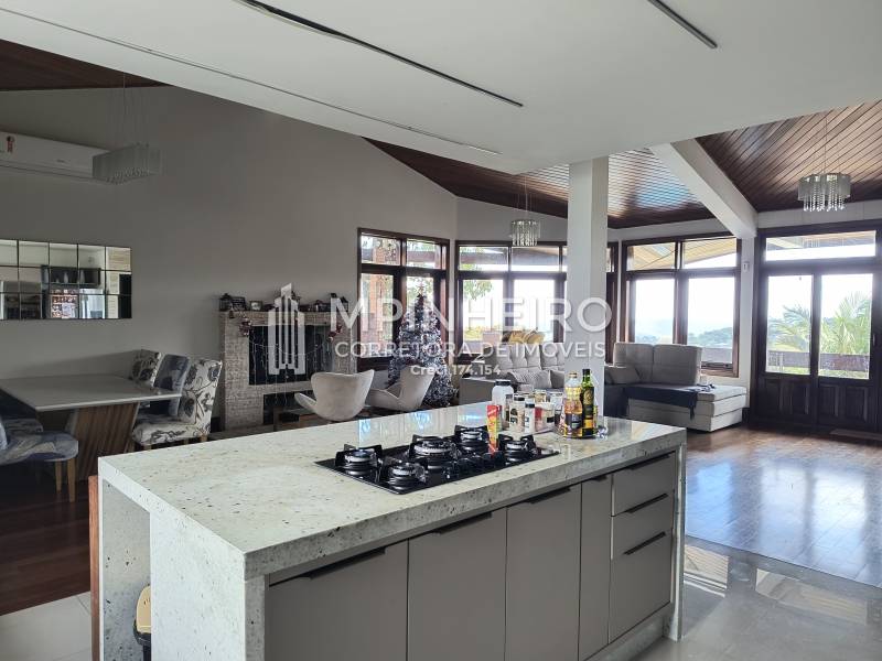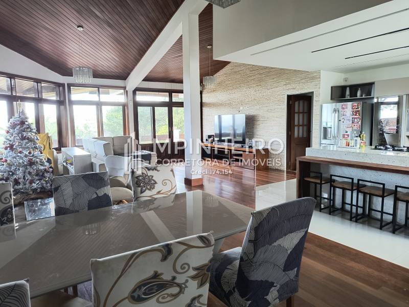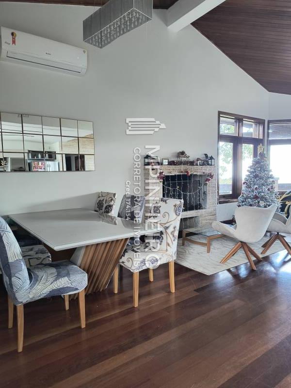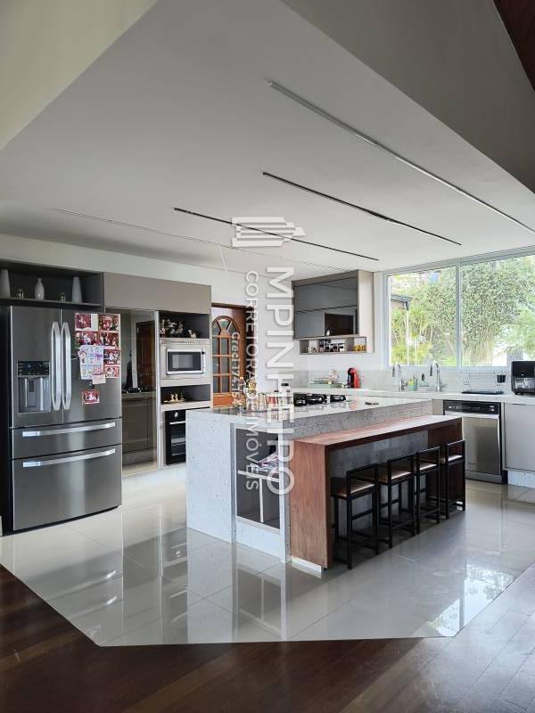 Casa com 5 dormitórios, sendo 2 suítes, uma master como closet e banheira de hidromassagem, quartos com armários planejados, sala ampla para 3 ambientes, lareira, com varanda, cozinha integrada com a sala, com armários planejados, lavabo, salão de festas ou jogos com cozinha gourmet integrada e avarandada, espaço para brinquedoteca ou academia, lavanderia ampla coberta, piscina aquecida e com cascata, churrasqueira completa, com banheiro na área da piscina, lareira de jardim
